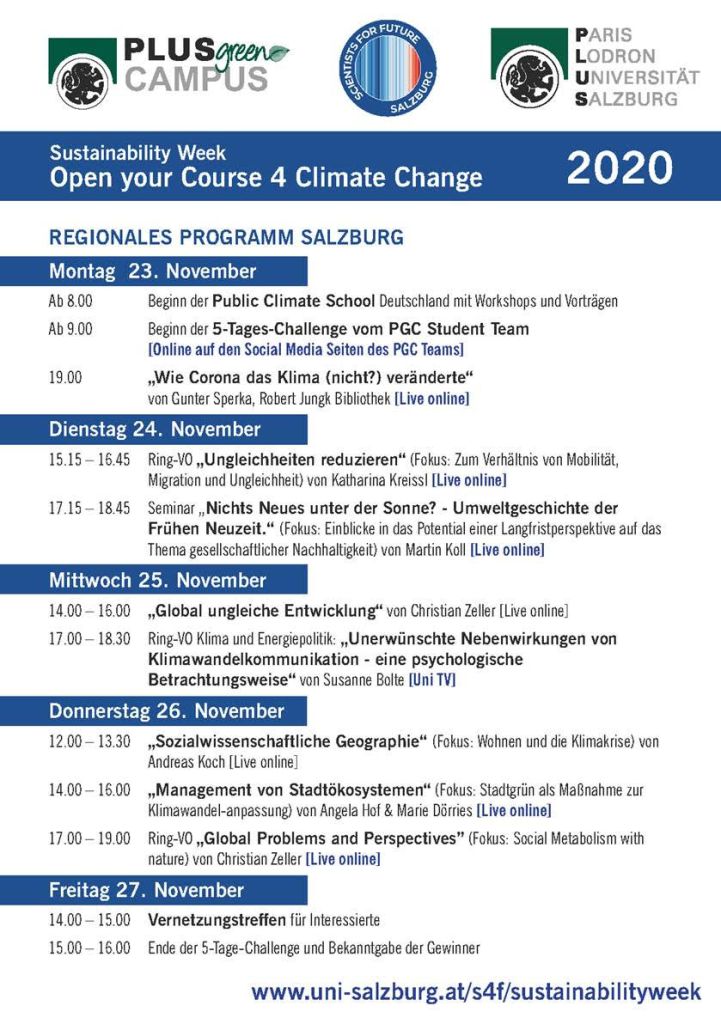 In der Woche vom 23. bis 27. November findet die Sustainability Week an der Universität Salzburg statt. Lehrende sind aufgefordert in ihren ohnehin stattfindenden Lehrveranstaltungen die Klimakrise und das Thema Nachhaltigkeit fachspezifisch anzusprechen. Dazu gibt es ein Programm der Universität Salzburg mit Vorträgen. Die JBZ ist in die Ringvorlesung zu Energie und Klima sowie mit einer Montagsrunde eingebunden. m Freitag findet abschließend ein Vernetzungstreffen statt, für alle die sich engagieren wollen oder einen Einblick in die Arbeit der PGC Students und Scientists4Future Salzburg bekommen möchten.
