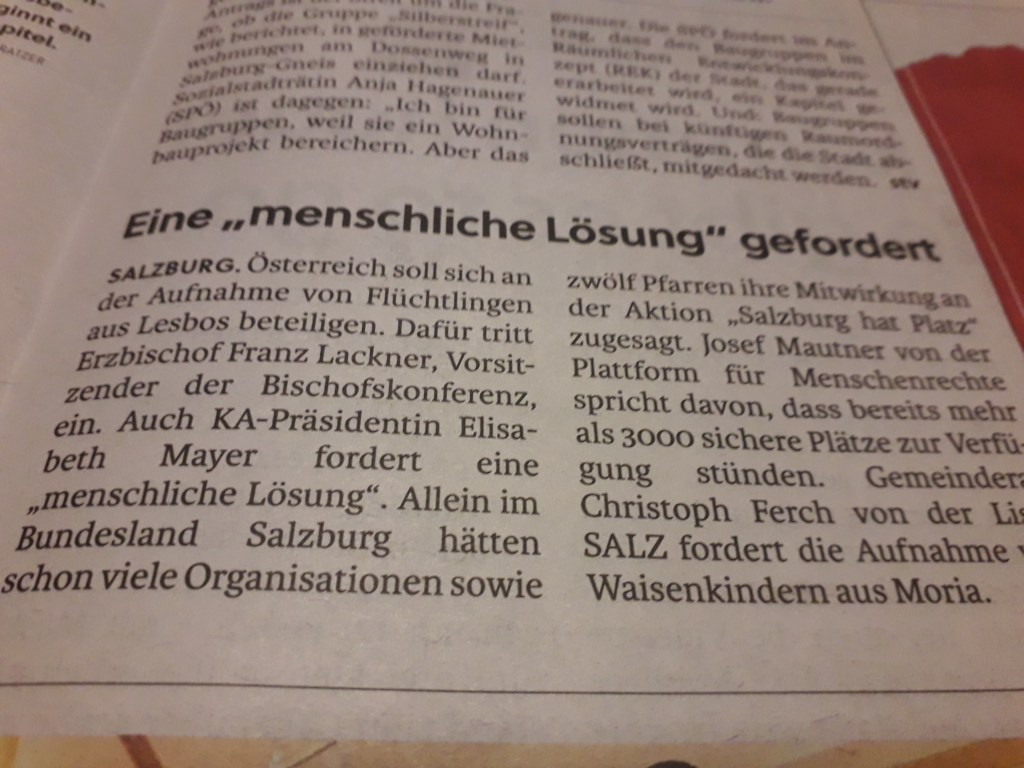 „Salzburg kann Menschen aus den Lagern auf den griechischen Inseln aufnehmen. Landeshauptmann Haslauer soll hier Druck auf die Bundesregierung ausüben,“ so die Plattform Menschenrechte in einer Aussendung. Immer mehr Organisationen der Zivilgesellschaft, Pfarren und Privatpersonen fordern die Politik auf, von Menschlichkeit nicht nur zu reden, sondern so zu handeln. Auch die Katholische Kirche und die Salzburger Arbeiterkammer fordern die Aufnahme von Geflüchteten. Erzbischof Franz Lackner hat sich ebenso wie Elisabeth Mayr, Präsidentin der Katholischen Aktion, dafür ausgesprochen. Oberndorf hat sogar einen Gemeinderatsbeschluss gefasst, wonach zwei Familien aufgenommen werden könnten. Im Salzburger Gemeinderat wird im Jänner über einen Antrag abgestimmt, dass sich die Stadt zur Aufnahme von Geflüchteten bekennt. Laut dem zuständigen Landesrat Heinrich Schellhorn gibt es im Bundesland derzeit leerstehende 270 Plätze zur Versorgung von Geflüchteten. Die Plattform für Menschenrechte hat die Aktion „Salzburg hat Platz“ ins Leben gerufen, um Aktivitäten zu koordinieren. Am Sonntag, den 20. Dezember rief ein breites Bündnis zivilgesellschaftlicher Organisationen zu einer Lichteraktion auf dem Platzl auf. Motto: Nie mehr Lager – Salzburg hat Platz. Eine Petition an Landeshauptmann Dr. Wilfried Haslauer und die Landesregierung ersucht die Landespolitik, sich bei der Bundesregierung für die Aufnahme von Geflüchteten einzusetzen. Es ist noch nicht zu spät!