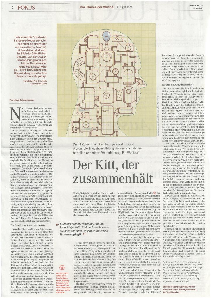„Der Kitt, der zusammenhält“ – unter diesem Titel ist in der Wochenzeitung „Die Furche“ vom 20. Mai ein lesenswerter Gastbeitrag von Jakob Reichenberger, Direktor des Bildungszentrums St. Virgil erschienen. Er beschreibt darin, warum Erwachsenenbildung viel mehr ist als die beruflich orientierte Weiterbildung.