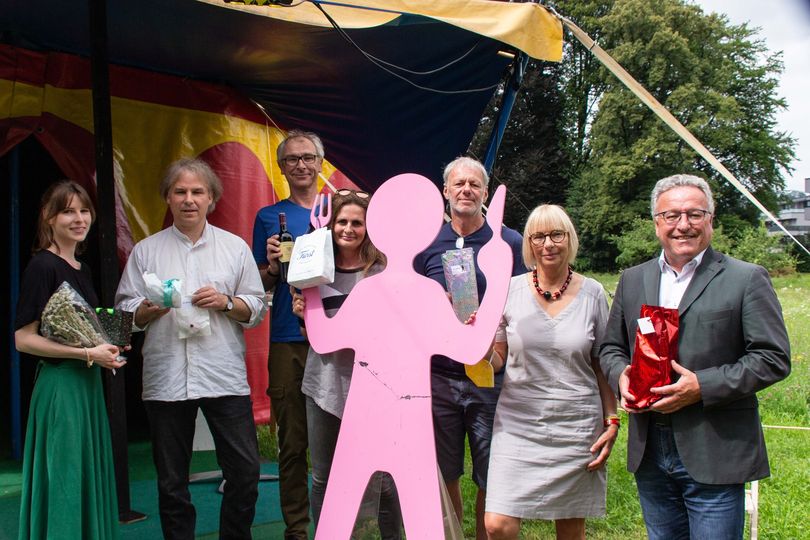 Seit 2006 – also 15 Jahre – organisiert der Dachverband.Kultur.Salzburg gemeinsam mit der Salzburger Armutskonferenz, Laube GmbH & Theater ecce die Aktion »Hunger auf Kunst & Kultur« im Bundesland Salzburg. Derzeit nehmen an die 220 Organisationen teil (inkl. Öffentlicher Bibliotheken). In den 15 Jahren wurden über 93.000 Karten im Gegenwert von über 1 Million Euro zur Verfügung gestellt. Im Bild: Gratulation an die Aktion beim Kulturfrühstück 2021 mit LHStv. Heinrich Schellhorn vor dem Spielzelt von Theater ecce.