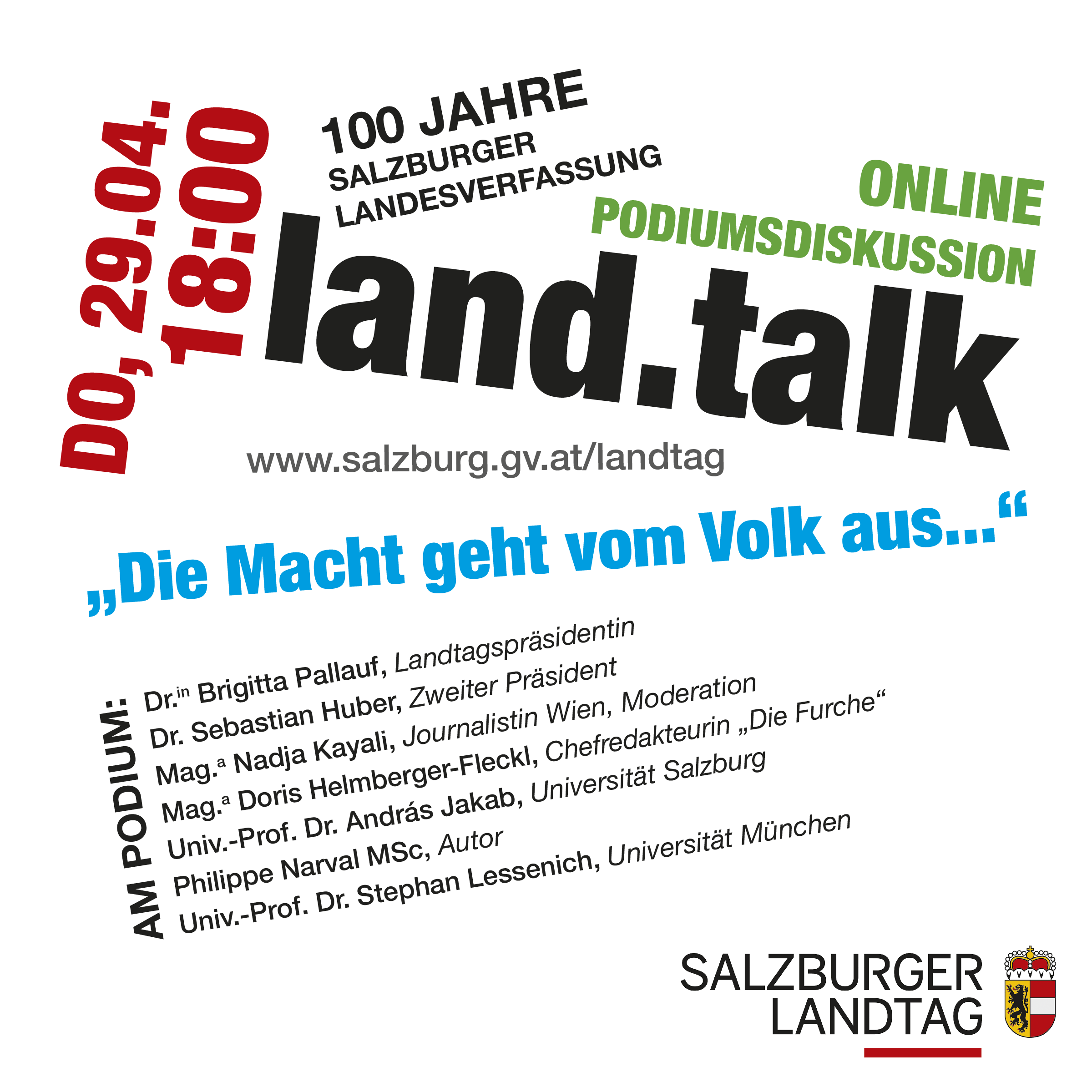 Anlässlich des 100jährigen Jubiläums der Salzburger Landesverfassung findet am Donnerstag, 23. September 2021 um 18:00 Uhr im Landtagssitzungssaal die nächste Podiumsdiskussion im Rahmen der land.talks statt. Ausgehend von einer Bestimmung in Artikel 1 unserer Landesverfassung wird die Beziehung Salzburgs zur EU näher beleuchtet: