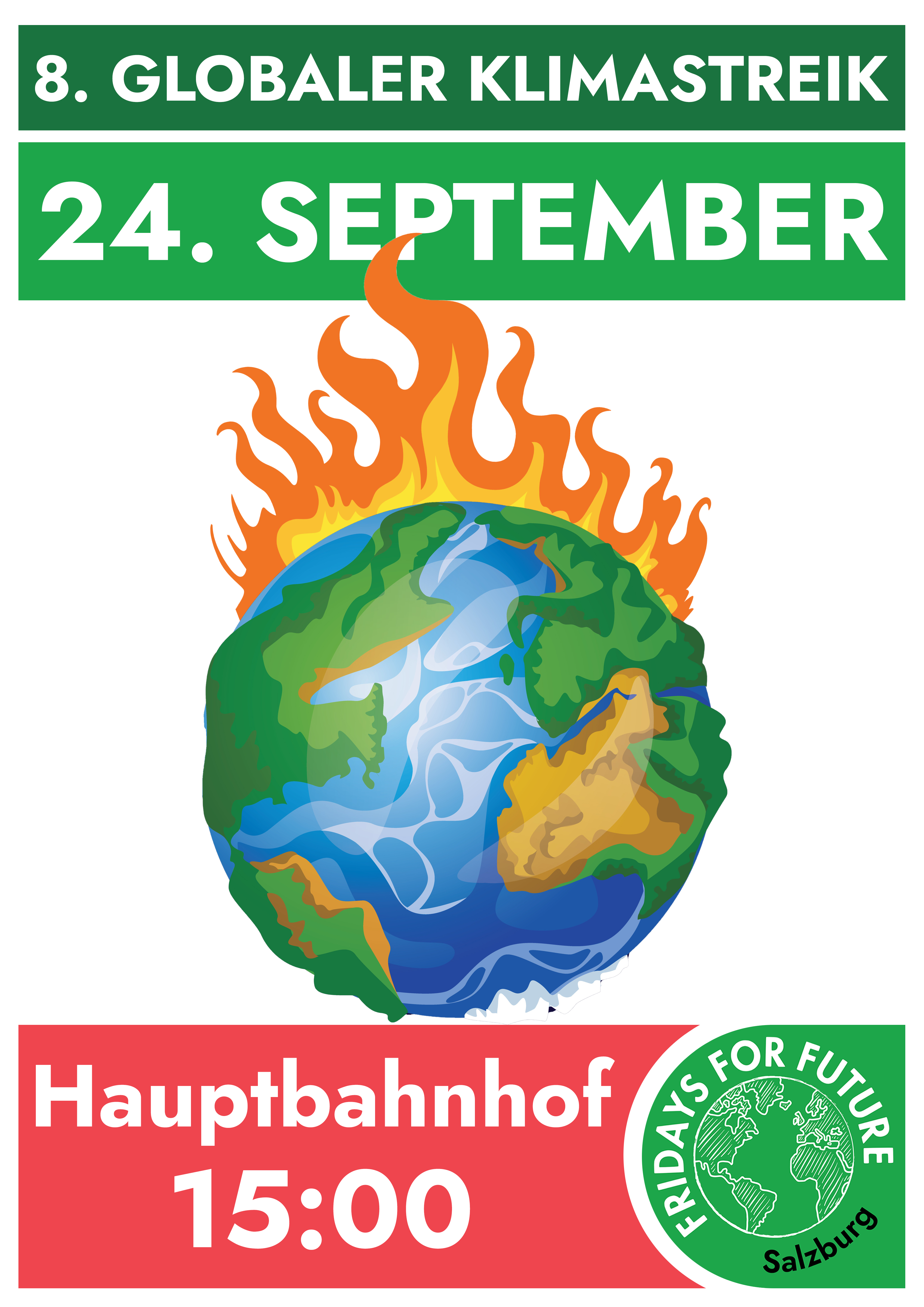 Am 24.9.21 ist der 8. weltweite Klimastreik und auch in Salzburg gehen wir wieder auf die Straße. Um 15 Uhr fängt unsere Demo am Salzburger Hauptbahnhof an.