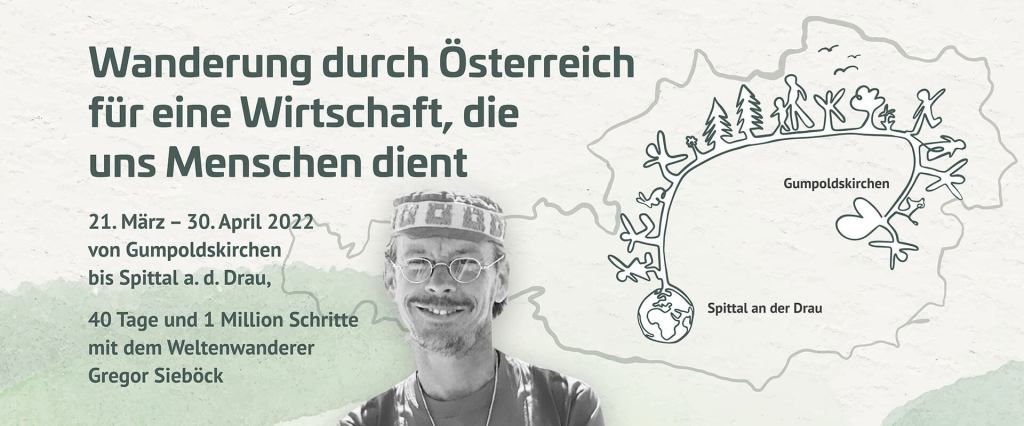 Am 21. März 2022 startet der Weltenwanderer Gregor Sieböck gemeinsam mit Georg Dygruber, Initiator der Ökonomie der Menschlichkeit, zu einer außergewöhnlichen Wanderung quer durch Österreich. Die Route führt über 800 km und 40 Tage durch fünf Bundesländer zu jenen Unternehmen, die bereits mit viel Konsequenz ihre Version der Menschlichkeit in ihren Betrieben leben. mehr