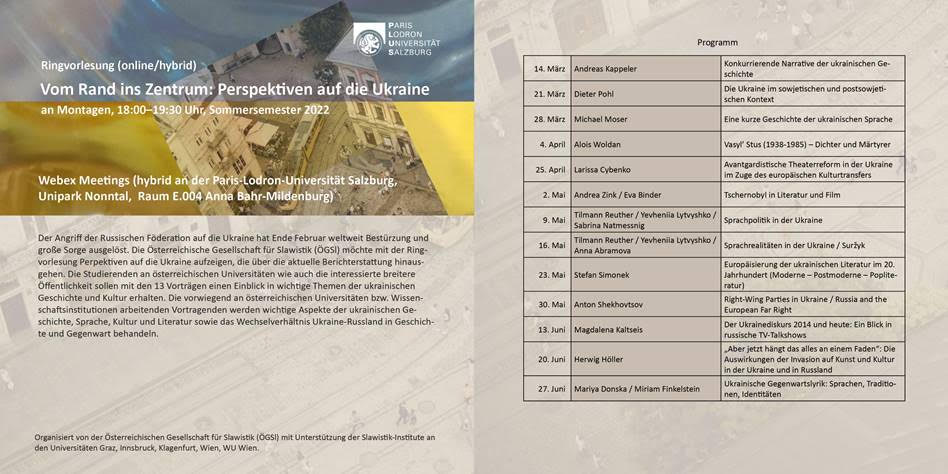 März 14, 2022März 14, 2022Hans Holzinger Ringvorlesung zur Ukraine an der Universität Salzburg | Ab 14.3. Jeden Montag von 18.00 bis 19.30 vor Ort im Unipark Nonntal sowie online Teilen mit: Klicke, um auf X zu teilen (Wird in neuem Fenster geöffnet) X Klick, um auf Facebook zu teilen (Wird in neuem Fenster geöffnet) Facebook Gefällt mir Wird geladen …