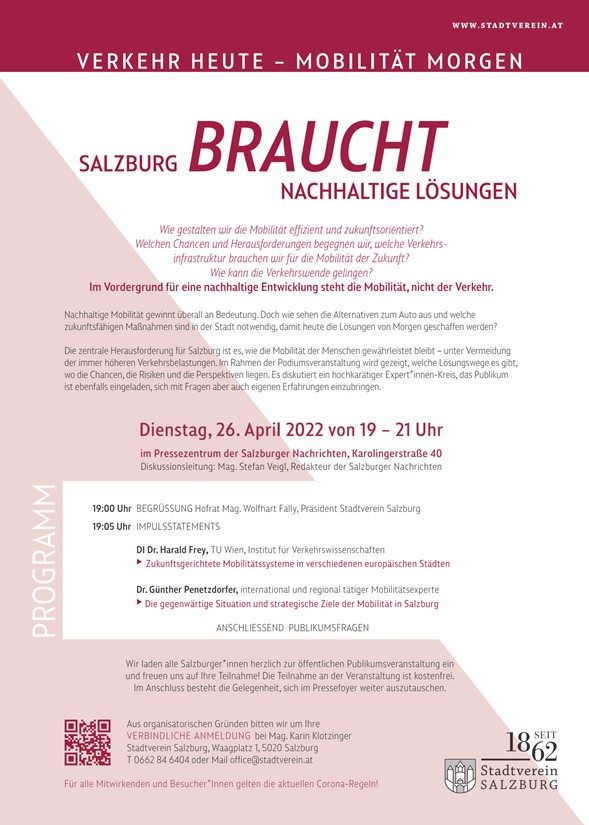 Eine wichtige Veranstaltung mit den Top-Verkehrsexperten DI. Dr. Harald Frey und Dr. Günther Penetzdorfer. Anmeldung bitte bei Mag. Karin Klotzinger, office@stadtverein.at