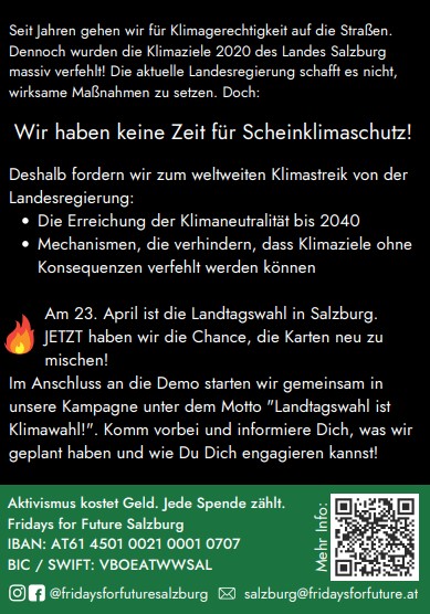 Februar 15, 2023Februar 15, 2023Hans Holzinger Weltweiter Klimastreik von Fridays for Future auch in Salzburg 3. März 2023 ab 15 Uhr Hauptbahnhof Teilen mit: Klicke, um auf X zu teilen (Wird in neuem Fenster geöffnet) X Klick, um auf Facebook zu teilen (Wird in neuem Fenster geöffnet) Facebook Gefällt mir Wird geladen …