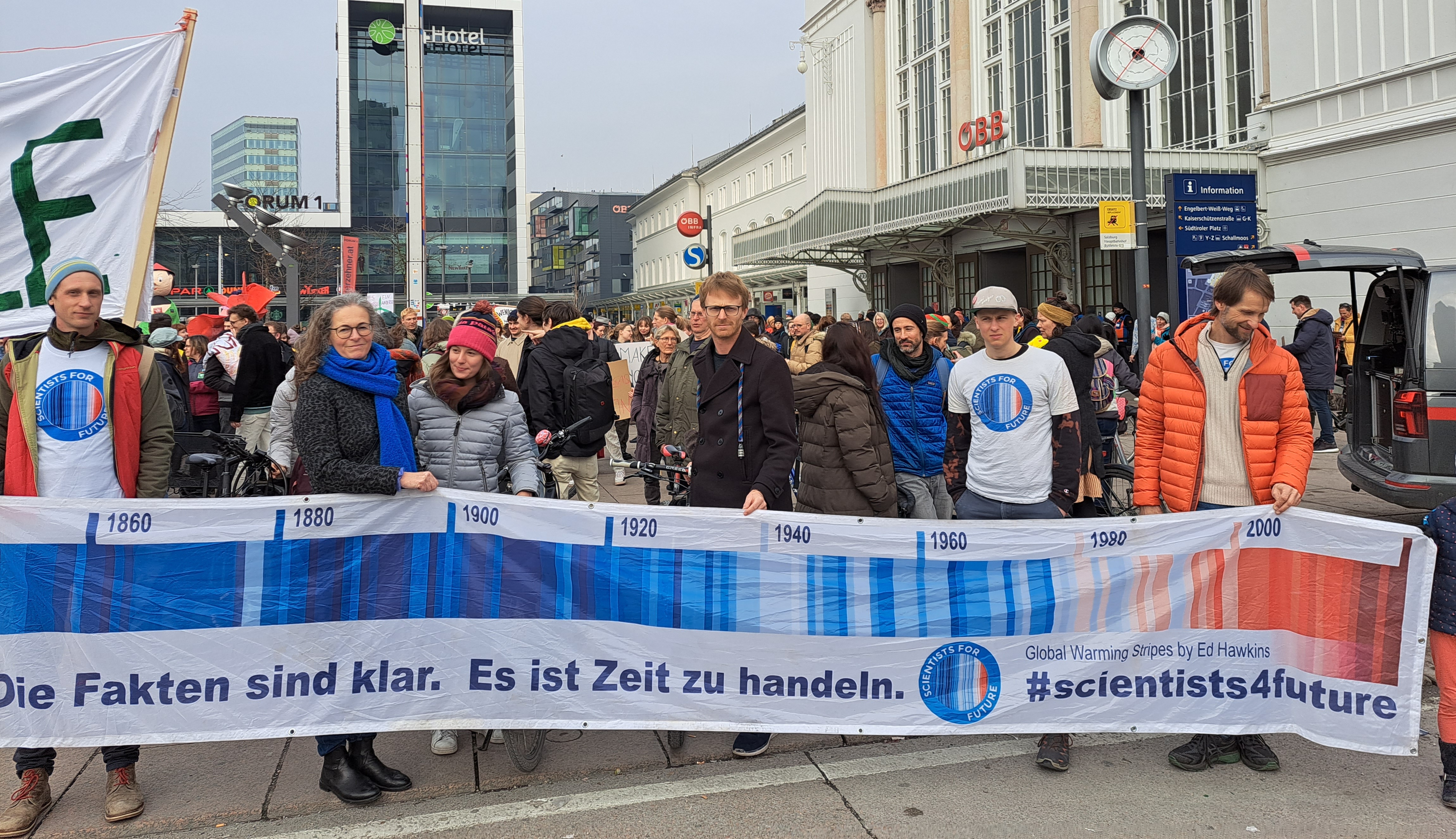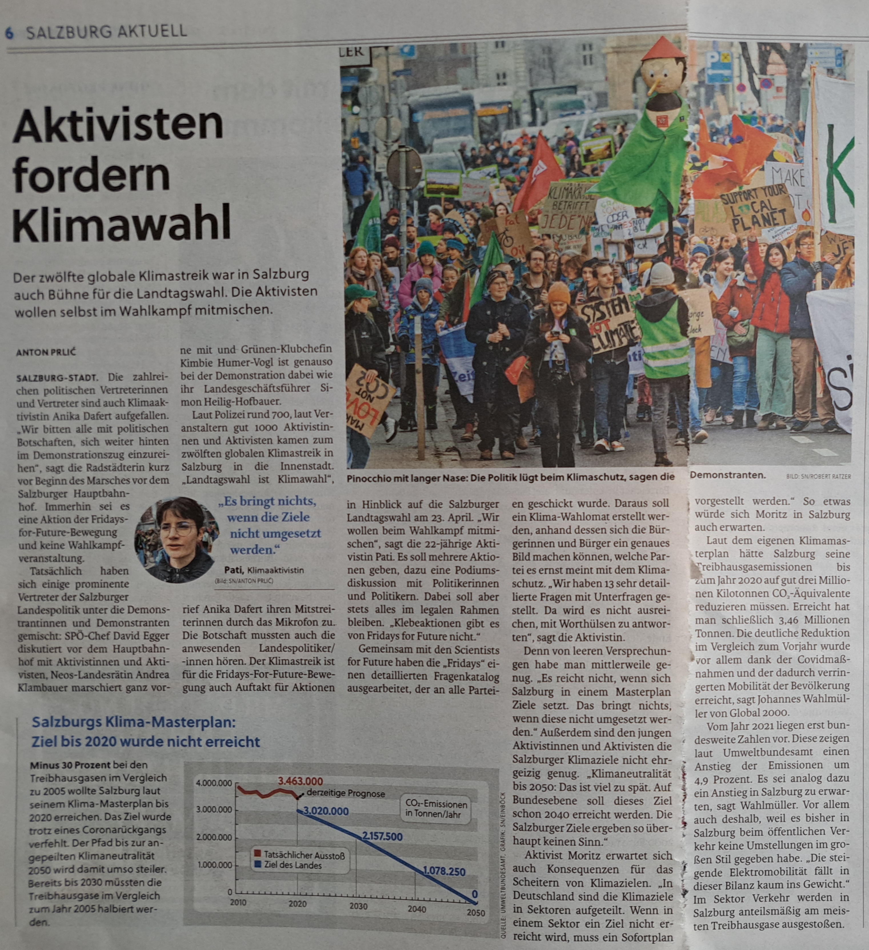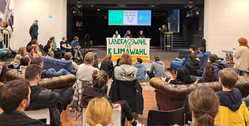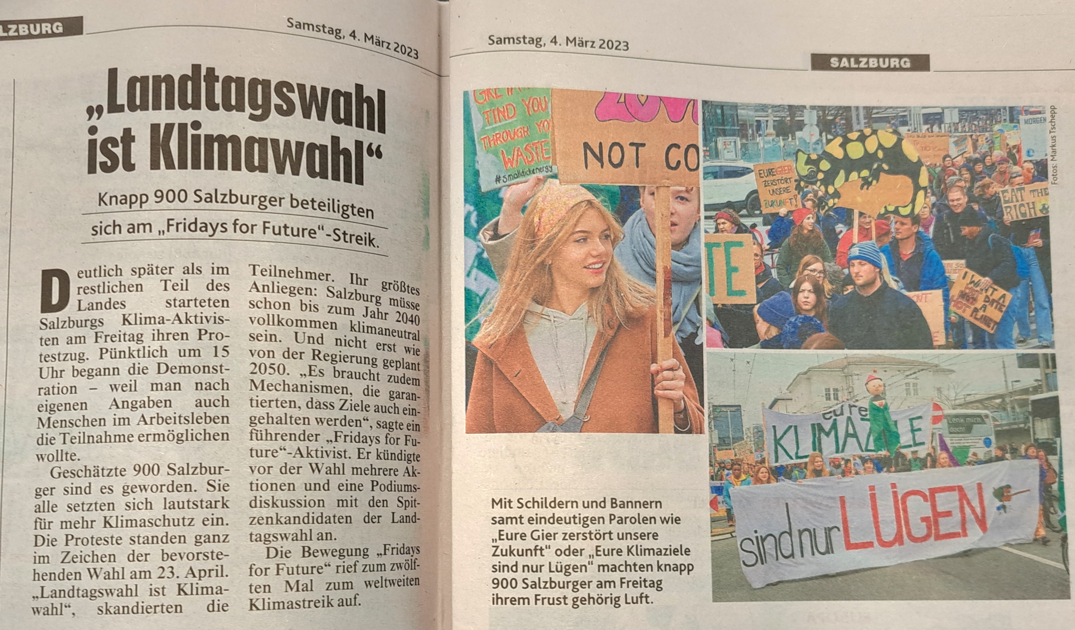 An die 30.000 Menschen beteiligten sich in zahlreichen österreichischen Städten am 12. weltweiten Klimastreik von Fridays for Future. In Salzburg waren es an die 1000 Menschen, die sich angesichts der bevorstehenden Landtagswahl für eine wirksamere Klimapolitik einsetzten. Ein von Mitgliedern von Scientists for Future Salzburger erstellter Fragebogen wurde allen wahlwerbenden Parteien übermittelt. Die bis 8. März erwarteten Antwort werden in den nächsten Wochen ausgewertet und nach Ostern der Öffentlichkeit präsentiert. Geplant ist ein Podiumsgespräch (vorr. 13.4.) sowie die Veröffentlichung der Antworten auf www.klimawahlen.at. Die ÖH Salzburg erstellt einen Infoflyer zum Verteilen. Die Demo wurde zudem von den Initiativen „Erde brennt“ und „Aktionsbündnis Mobilitätswende Salzburg“ unterstützt, die sich gemeinsam mit den Aktivist:innen von Fridays for Future im Anschluss an die Demo zu einen Aktionsabend im Jugendzentrum Yoko trafen. Das breite Medienecho lässt hoffen, dass die Antworten der Parteien auf die 12 Fragen bald eintreffen. Den Fragenkatalog sowie die Presseberichte findet ihr in den Links. Fotos: H. Holzinger