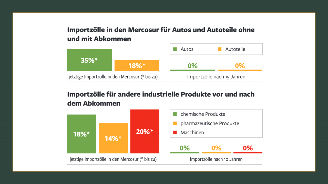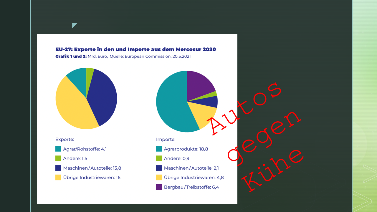 Etwas verkürzt könne man sagen, beim Mercosur-Abkommen gehe es um „Autos gegen Kühe“, so Kofler. Das Abkommen hätte jedoch drastische Folgen für die Umwelt, das Klima und die Menschen- und Sozialrechte. Lateinamerikanische Industriegewerkschaften fürchten um ihre Arbeitsplätze, die europäischen Landwirte und Landwirtinnen um Billigkonkurrenz. Rindfleisch aus Argentinien oder Brasilien würde die europäische Fleischproduktion bedrohen. Umweltinitiativen und der Konsumentenschutz warnen vor dem Import von landwirtschaftlichen Produkten, die mit Pestiziden behandelt sind, wie sie in der EU längst verboten sind. Dazu kommen die gesundheitlichen Schäden für die Landarbeiter vor Ort. Die weitere Abholzung von Regenwald sowie die weitere Expansion der fossil getriebenen Mobilität sind zwei Kritikpunkte, die aus Sicht des Klimaschutzes schlagend werden. Die europäischen Chemieindustrie wiederum würde sich freuen, wenn sie in der EU verbotene Pestizide zollfrei nach Lateinamerika exportieren könnte. Die Autoindustrie hofft auf den Export von Fahrzeugen mit Verbrennungsmotor, nachdem diese in der EU ab 2035 verboten sein werden, so Kofler. Eine von ihr zitierte Mitte 2022 veröffentlichte Studie* „Mobilitätswende ausgebremst. Das EU-Mercosur-Abkommen und die Autoindustrie” zeigt, wie Autokonzerne die Verhandlungen über das Mercosur-Abkommen erheblich beeinflusst haben – und in besonderem Maße davon profitieren würden.