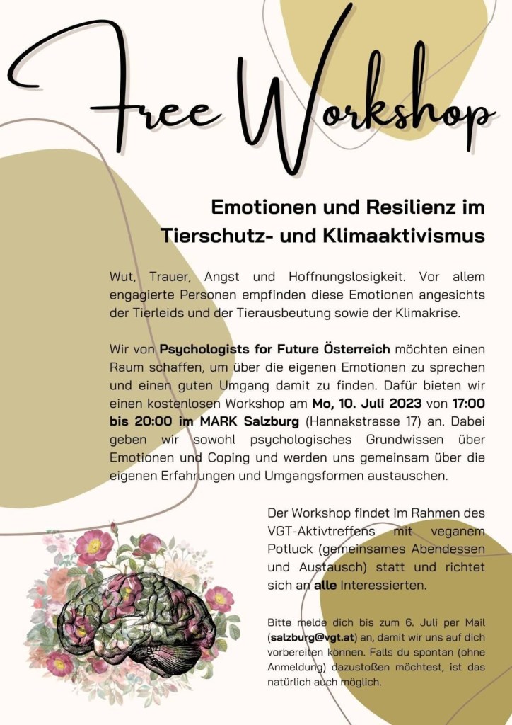 Zusammen mit Psychologists for Future Österreich führt der Verein gegen Tierfabriken am 10. Juli von 17-20 Uhr im MARK (Hannakstraße 17) einen kostenlosen Workshop mit dem Titel „Emotionen und Resilienz im Tierschutz- und Klimaaktivismus“. Die Veranstaltung findet inklusive einem veganen Potluck statt – das heißt, es wäre cool, wenn jede Person etwas Veganes zu essen mitbringt und wir essen dann gemeinsam , so Alexandra Bobis vom VGT Salzburg.