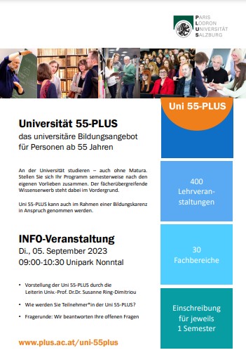 Die Initiative 55+ der Universität Salzburg schreibt das neue Angebot für das universitäre Bildungsangebot für Personen ab 55 Jahren aus. Die Infoveranstaltung finde am 5. September ab 9 im Unipark Nonntal statt. Das kündigen wir gerne an.