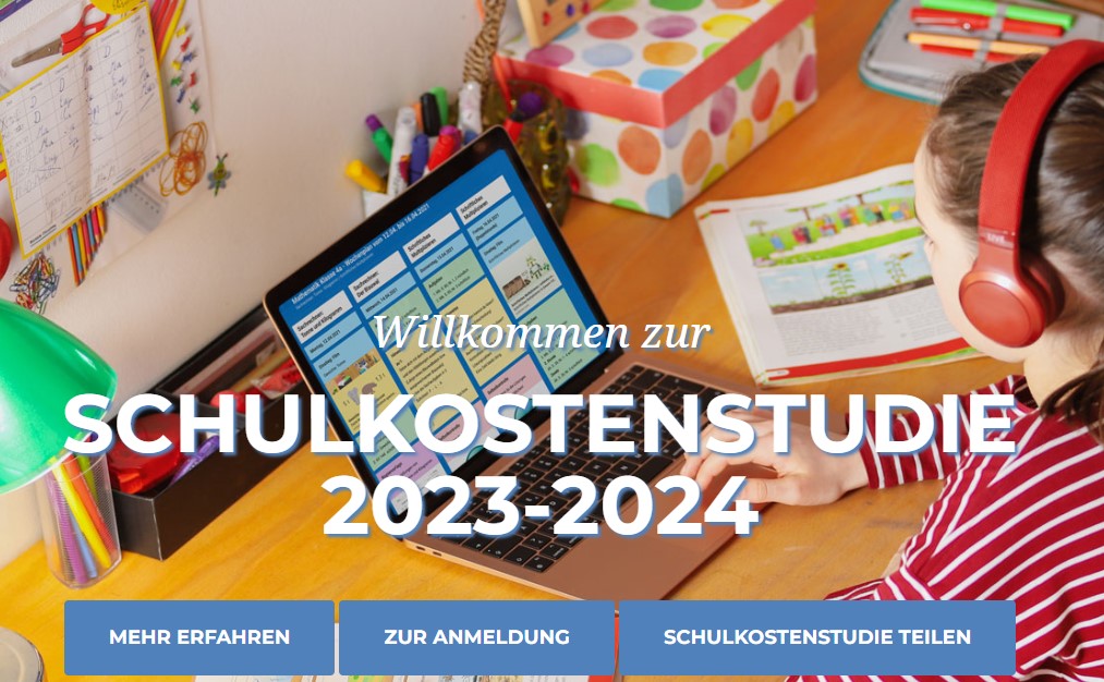 Bitte rufen Sie in Ihrem beruflichen und privaten Umfeld Eltern zur Teilnahme an dieser Studie auf. Als kleines Dankeschön winken jeden Monat tolle Sachpreise. Alle Informationen zur Erhebung selbst sowie zum Mitmachen sind auf www.schulkosten.at zu finden.. Die Anmeldung ist bis 29. September 2023 möglich.