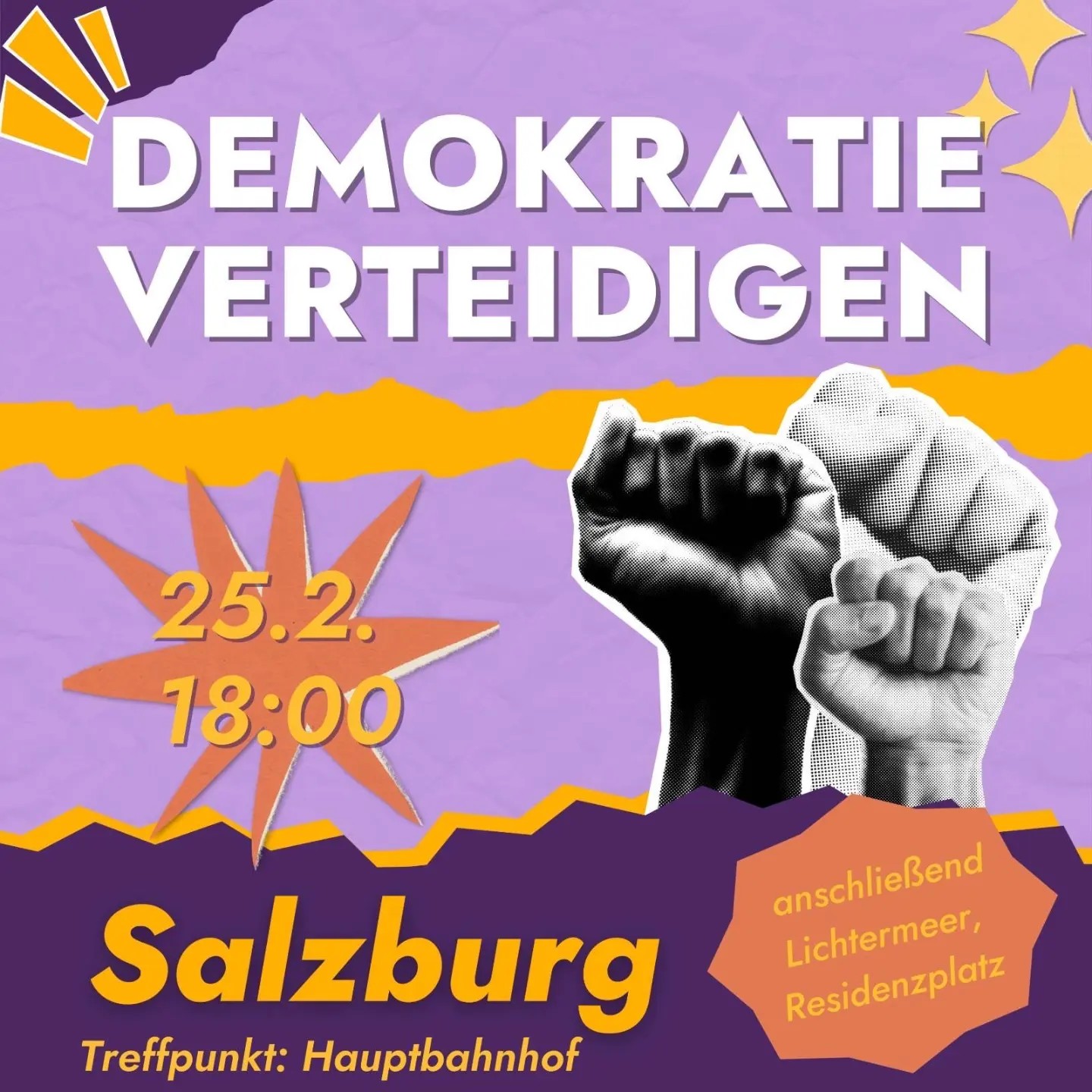 Als Teil der österreichweiten Aktion findet auch in Salzburg eine Demo statt, mit der wir lautstark zeigen, dass wir keinen Rechtsruck dulden!