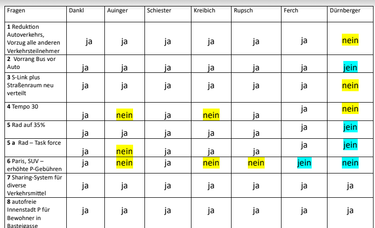 Erstaunlich war, dass die Parteien mehrheitlich den Forderungen zustimmten (siehe unten). Den Wahlversprechen müssen aber dann die Taten folgen! Ein unerwartet erfreuliches Ergebnis des Abends war die Zustimmung von sechs der sieben SpitzenkandidatInnen zur Frage Nummer 5: „Sind Sie dafür, dass die Stadt Salzburg bis 2035 einen Radverkehrsanteil von mindestens 35 Prozent anstrebt und dafür ein Sonderbudget von 40 Millionen Euro dotiert? Florian Kreibich (ÖVP), Bernhard Auinger (SPÖ), Anna Schiester (Bürgerliste/Grüne), Lukas Rupsch (NEOS), Kay-Michael Dankl, (KPÖ Plus) und Christoph Ferch (Liste SALZ) antworteten darauf klar mit Ja. Nur Paul Dürnberger (FPÖ) enthielt sich. Im Wahlprogramm scheint nämlich nur bei der Bürgerliste und KPÖ+ eine deutliche Erhöhung des Radbudgets auf!