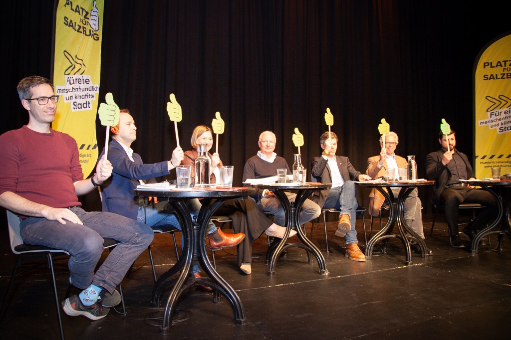 Vor einem vollem Saal in der Arge Nonntal wurden die Spitzenkandidat:innen der Parteien zu den Forderungen zu verkehrsberuhigenden Maßnahmen in der Stadt Salzburg befragt. Die Bürgerinitiative – „Platz für Salzburg“- hat in einem langen Prozess 22 Schritte zur unmittelbaren Umsetzung längst brennender Anliegen der Bürger:innen der Stadt formuliert. In dieser Veranstaltung mussten die Politiker:innen Farbe bekennen. Ein klares Ja oder Nein als erste Festlegung wurde nicht nur von diesen eingeholt, sondern das Publikum konnte ebenso mit grünen oder roten Karten seinen Standpunkt einbringen. Presse