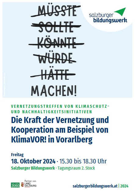 Das Salzburger Bildungswerk und die Salzburger Umwelt- und Nachhaltigkeitsvernetzung SUN laden zu einem weiteren Treffen ein. Dieses Mal wird es einen Input von Dr. Kriemhild Büchel-Kapeller von KlimaVOR, der Vernetzungsplattform der Klimainitiatven in Vorarlberg geben (mehr siehe im Anhang). Wir fragen, was wir aus diesem Projekt lernen können. Ein weiteres Thema wird ein angedachter „Salzburger Tag der Nachhaltigkeit“ (vorr. 16. Mai 2025) sein, bei dem neben inhaltlichen Veranstaltungen auch Aktionen von NGOs Platz haben sollen. Motto: Aufbruch für ein gutes Leben für alle! Zudem gibt es wieder genug Raum für Austausch und Vernetzung.