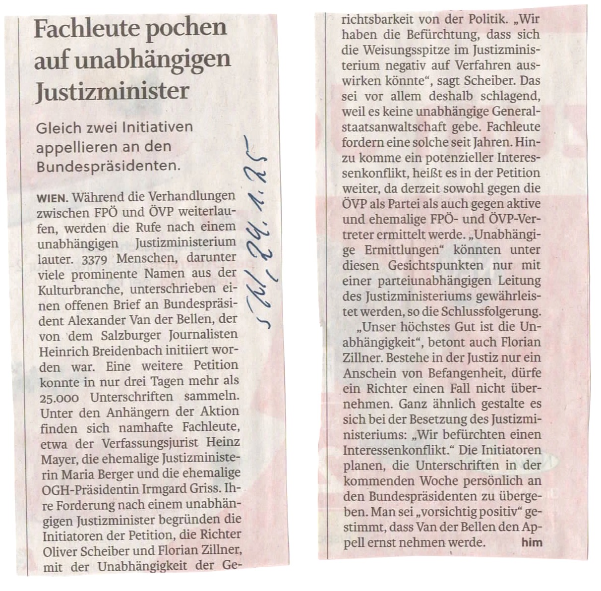In einem vom Salzburger Journalisten Heinrich Breidenbach initiierten Offenen Brief wird Bundespräsident Alexander van der Bellen aufgefordert, bei der Besetzung des Justizministeriums der neuen Regierung auf eine unabhängige Person zu drängen. Mehr siehe Breidenbachs Blog. Der Brief wurde innerhalb kurzer Zeit von 3379 Menschen unterzeichnet. Eine weitere Petition konnte in nur drei Tagen an die 25.000 Unterschriften sammeln. Unter den Unterzeichnenden sind die ehemalige Justizministerium Maria Berger und die ehemalige OGH-Präsidentin Irmgard Griss. Einer der Gründe lautet, dass derzeit sowohl gegen ehemalige FPÖ- als auch ÖVP-Vertreter ermittelt wird. Es wird spannend, wie sich der Bundespräsident in der aus Causa verhalten wird.