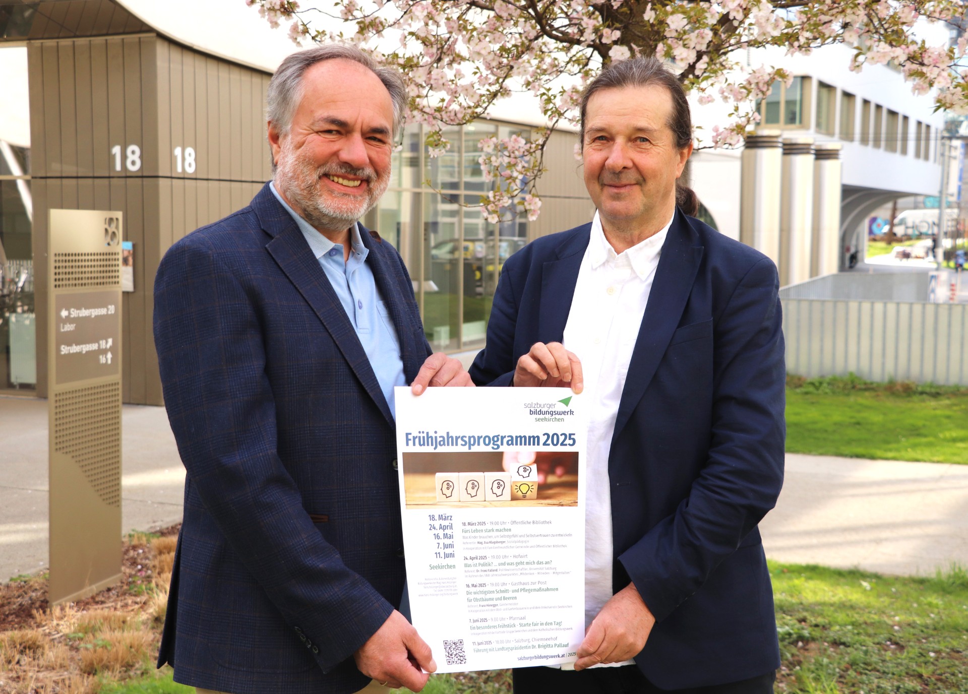 Mag. Hans Holzinger, Bildungswerkleiter von Seekirchen, präsentiert gemeinsam mit Dipl. Ing. Richard Breschar, Direktor des Salzburger Bildungswerkes, sein Frühjahrsprogramm, in dem Demokratie behandelt wird.