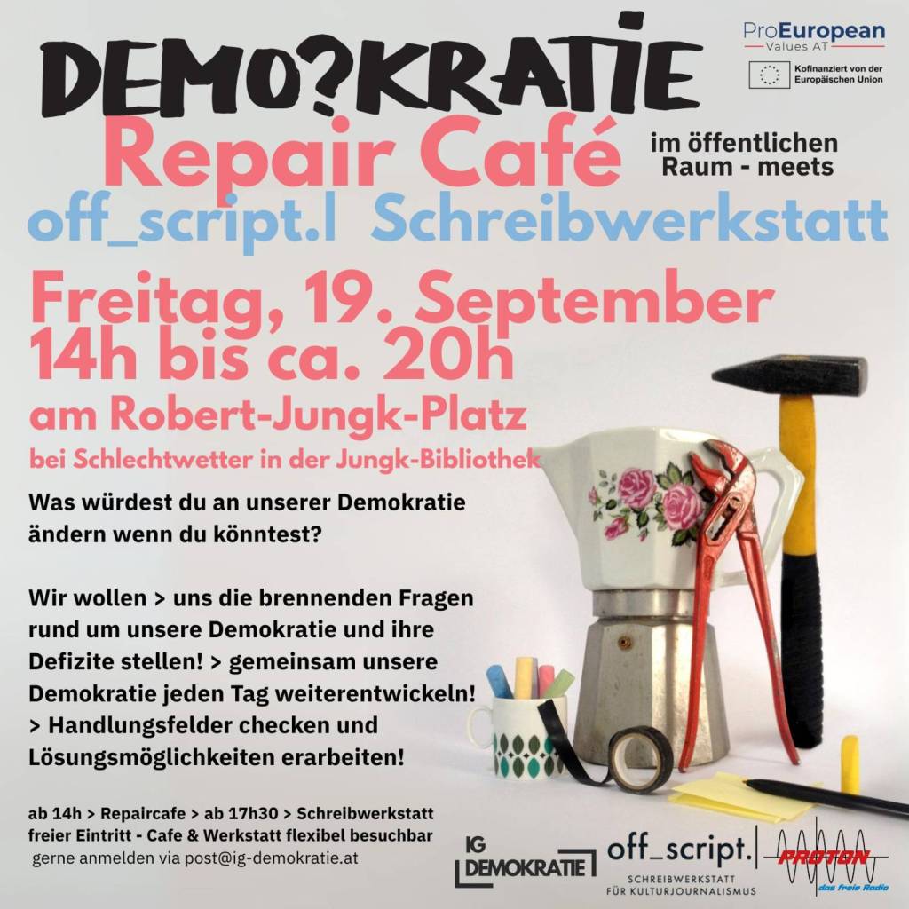 September 2, 2025September 2, 2025Hans Holzinger „Demokratie-Repair Cafe“ am Robert-Jungk-Platz der IG Demokratie 19.9 Das klingt spannend! Anmeldung bitte unter post@ig-demokratie.at oder einfach vorbeischauen! Teilen mit: Klicke, um auf X zu teilen (Wird in neuem Fenster geöffnet) X Klick, um auf Facebook zu teilen (Wird in neuem Fenster geöffnet) Facebook Gefällt mir Wird geladen …