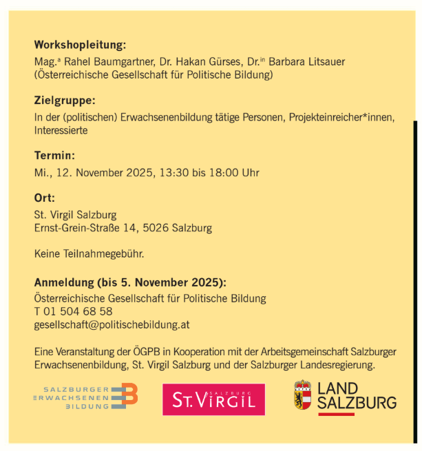 Vereine it Sitz in Salzburg, die Bildungsveranstaltungen durchführen, können bei der Österreichischen Gesellschaft für Politische Bildung hiefür um Förderungen ansuchen. Am 12. November gibt es eine Info-veranstaltung dazu in St. Virgil Salzburg. Wer sich Ansuchen überlegt, erfährt dort Genaueres. Anmeldung bs 5.11. bei gesellschaft@politischebildung.at