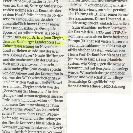 Kritischer Leserbrief in den SN zu Interview mit Nestle-Chef
